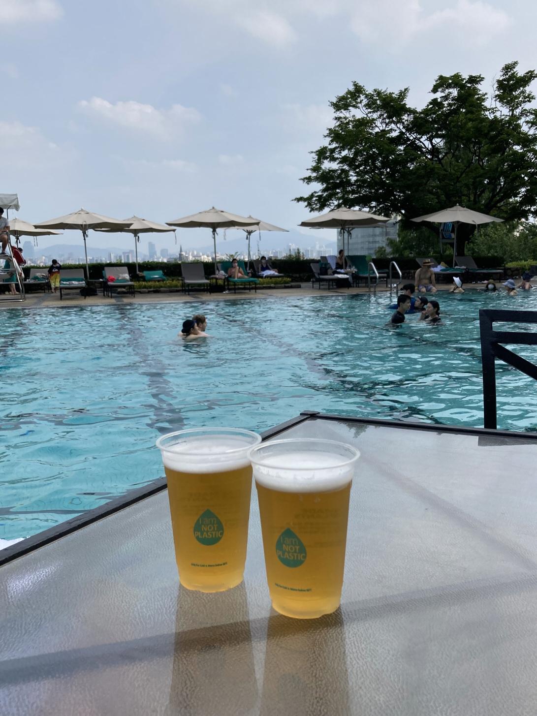 신나게 한참을 놀다가 간식거리를 먹으러 카페테리아 쪽 테이블로 자리를 잡아봅니다. 일단 맥주부터 주세요! 호캉스에서 시원한 생맥주 빠질 수 없잖아요. 천국의 맛이 따로 없습니다. 벌컥벌컥 한숨에 마셨지요. 원샷은 참아주세요. 호텔 맥주 가격은 매우 사악합니다. 기분 내기용으로 한잔 정도만 즐겨보는 걸로 해요.
