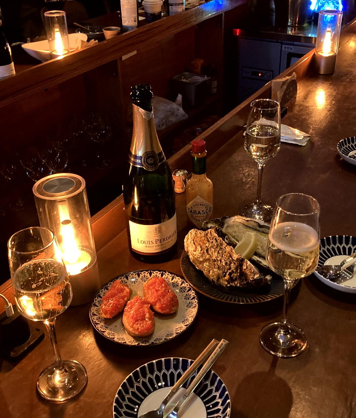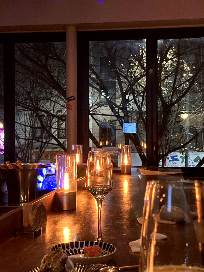 조금 뒤에 안주가 나왔습니다. 기본 안주로 주시는 빵과 주문한 통영 삼베체 굴. 그냥 세팅만 해놓았을 뿐인데 너무 예쁘지요~? 조명과 샴페인, 샴페인 잔이 제대로 된 무드를 만들어줍니다. 사진을 계속 찍을 수밖에 없는 비주얼입니다.