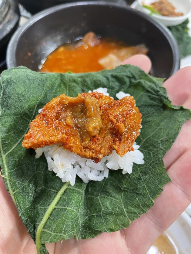 호박입을 쪄서 주시는 반찬도 나오는데, 거기에 흰밥을 올리고 제육볶음을 함께 싸서 한입에 넣으면 이곳은 그냥 극락이다. 씁쓸한 맛이 전혀 없고, 푹 삶아져서 너무 풍미도 좋고 고기와도 정말 잘 어울린다. 반찬은 모자라면 더 달라고 하면 주시니까, 부담 가질 필요 없이 요청드리면 된다. 그러나 절대 남겨서는 안 된다. 먹을 만큼만 먹는 걸로!