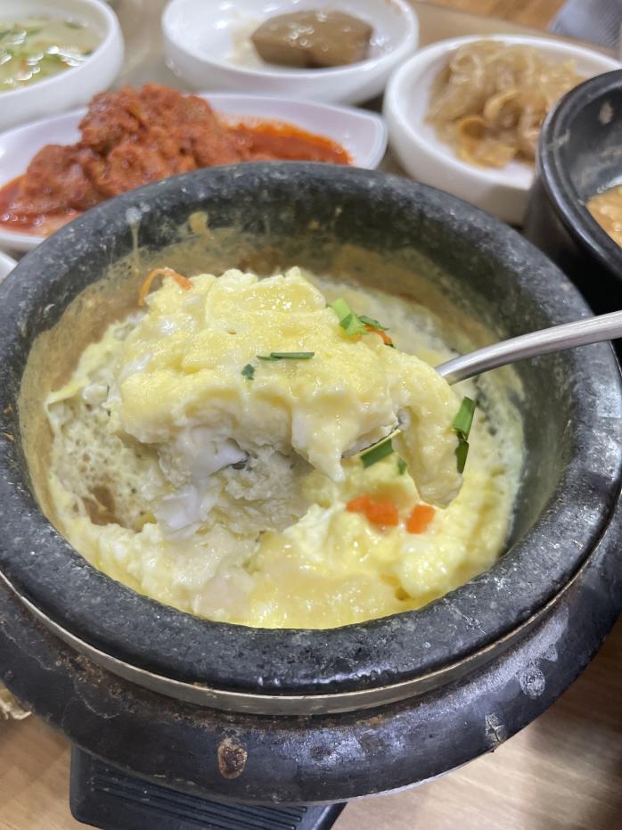 포슬포슬한 계란찜이다. 이건 간이 거의 안되어있었다. 반찬들이랑 찌개들이 간이 쎄니까 뭔가 중화시켜주는 메뉴가 된 느낌이라서 좋았다. 전주 백반 맛집에 뚝배기 계란찜이 빠질 순 없으니까!