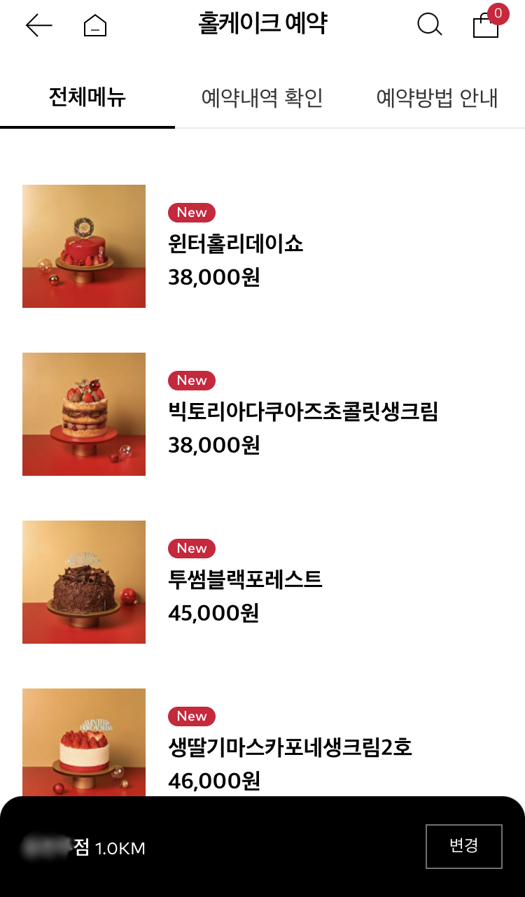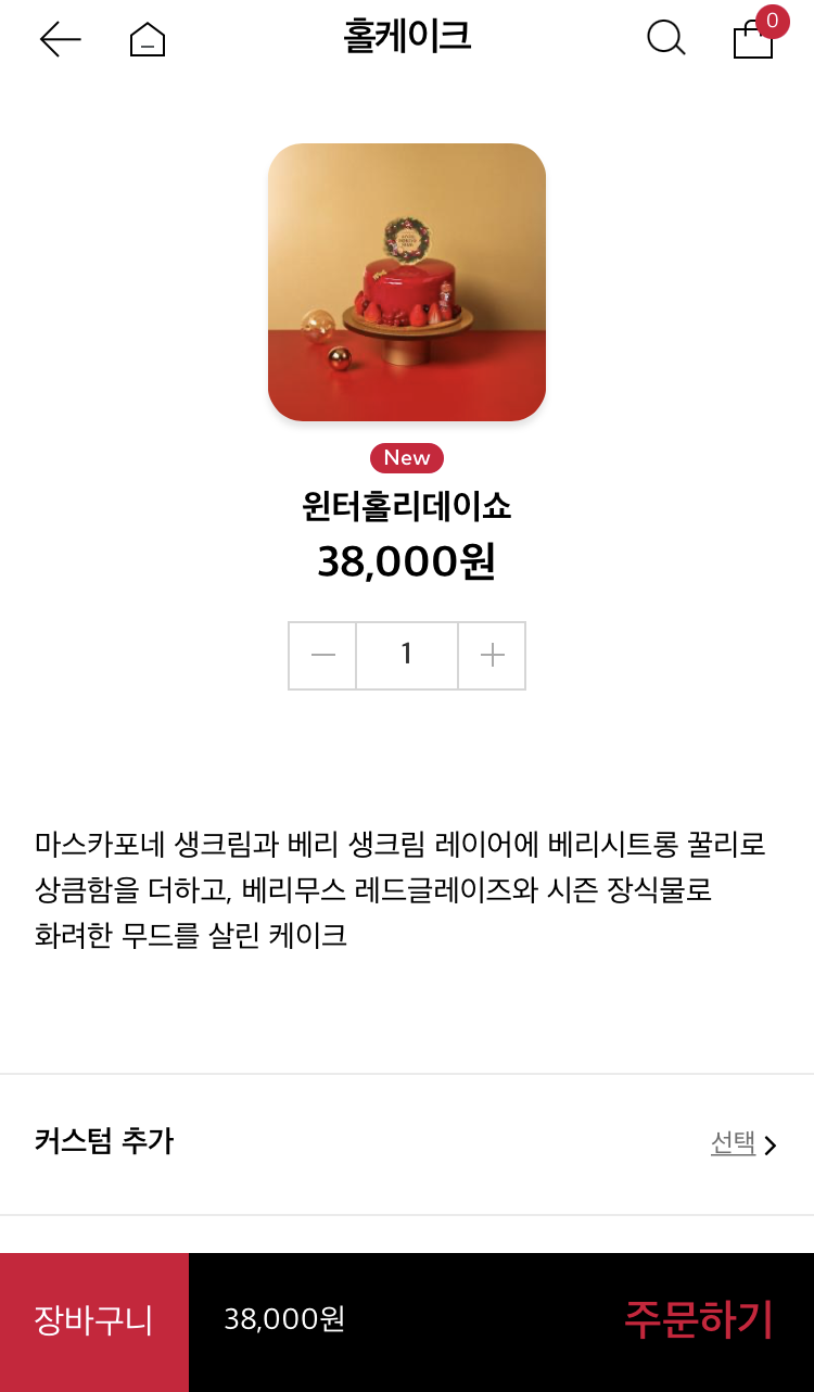 저는 눈에 가장 들어오는 1번 케이크였던 윈터 홀리데이 쇼 케이크를 선택해봤습니다. 마스카포네 생크림과 베리 생크림! 거기에 꿀리로 상큼함까지! 색감과 비주얼부터 연말, 크리스마스 느낌이 물씬 풍깁니다. 맛도 너무 기대되는데요!